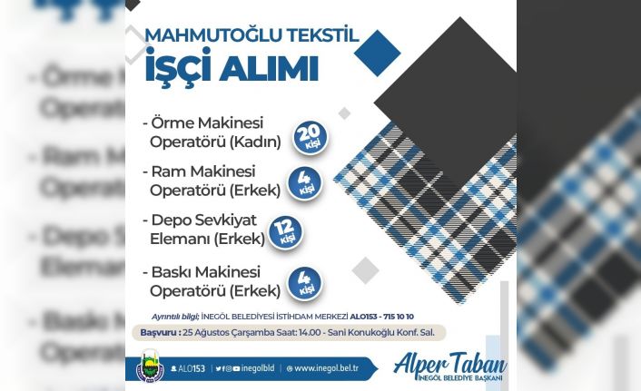 Belediye İstihdam Merkezi, İnegöl Organize Sanayi Bölgesinde hizmet veren Mahmutoğlu Tekstil firmasının kadın-erkek 40 personel alımı yapacağını duyurdu.