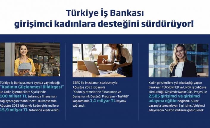 Banka, Avrupa İmar ve Kalkınma Bankası (EBRD) ile imzaladığı sözleşmeyle, “Kadın İşletmelere Finansman ve Danışmanlık Desteği Programı-TurWiB” kapsamında sağladığı 76 milyon dolar kaynağı, Ağustos 2022’den itibaren 18 ay içinde belirlenen kriterlere uygun müşterilere kullandırıyor. İş Bankası, bu sözleşme ile 2023 Ağustos ayı itibarıyla kadın işletmelere 1,1 milyar TL kaynak sağladı.