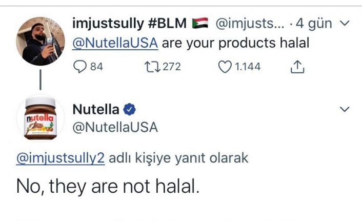 Çikolata firmalarından Nutella, sosyal medyada bir kişinin "Nutella helal mi?" sorusuna, "Hayır, helal değil" diye cevap verdi. Firmanın bu cevabı üzerine Türkiye’nin en fazla fındık üretilen ili Ordu’dan cevap gecikmedi. Ordu Büyükşehir Belediye Başkanı Hilmi Güler, sosyal medyadan Ordu’da üretilen kakaolu fındık kremalarını paylaşarak, "Bizim safımız yıllardır belli. Hem yerli, hem helal" ifadelerini kullandı.
