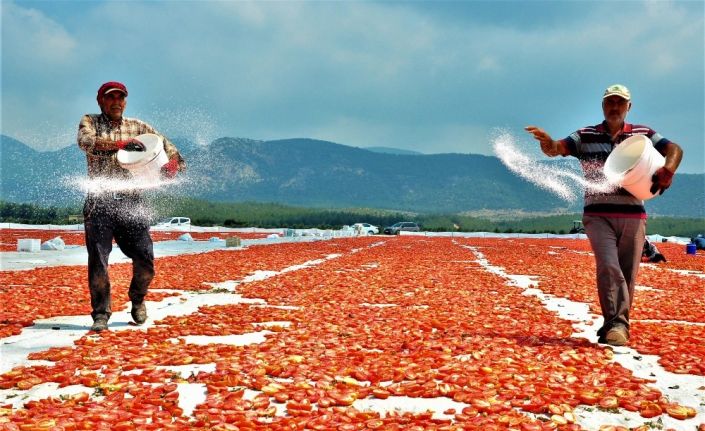 Türkiye’de kurutulmuş domatesin en önemli merkezlerinden biri olan Manisa’nın Turgutlu ilçesinde de hasat edilen domatesler, kurutulmak için serilmeye başlandı. Kurutmalık olarak değerlendirilecek domatesler için erken saatlerde tarlaya gelen işçiler, gün batımına kadar hummalı şekilde çalışıyor. Yaklaşık 15 kilogram yaş domatesten elde edilen 1 kilogram kuru domates, Covid-19 salgını sebebiyle ekim alanı azalan Türkiye’nin en büyük rakibi İtalya ve Amerika başta olmak üzere, Rusya, Almanya ve İngiltere pazarında kilogramı 3 Euro’dan alıcı buluyor.