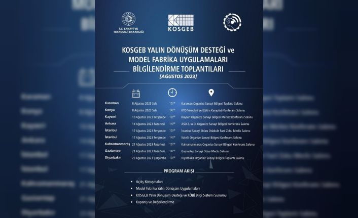 KOSGEB Yalın Dönüşüm Desteği hakkında bilgi vermek ve Model Fabrikalarda gerçekleştirilen yalın dönüşüm uygulamalarını tanıtmak amacıyla da 26 ilde toplam 30 adet KOSGEB Yalın Dönüşüm Desteği ve Model Fabrika Uygulamaları Bilgilendirme Toplantısı düzenlenecek. İlk olarak 8 Ağustos’ta Konya ve Karaman, 10 Ağustos Kayseri, 14 Ağustos Ankara, 17 Ağustos İstanbul illerinde gerçekleştirilecek toplantıların takvimleri belirlendikçe duyurusu yapılacak.