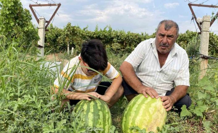 Alaşehir ilçesine bağlı Delemenler Mahallesi’nde üzüm üretimi yapan 65 yaşındaki çiftçi Ahmet Ölmez’in yenice üzüm bağının kenarına diktiği karpuzlar iriliği ile dikkat çekiyor. Kendisiyle aynı ismi taşıyan torunuyla karpuz bostanında karpuzları kaldırmaya çalışan Ahmet Ölmez oldukça zorlanırken, torunu ise karpuzları yerinden kıpırdatamadı.