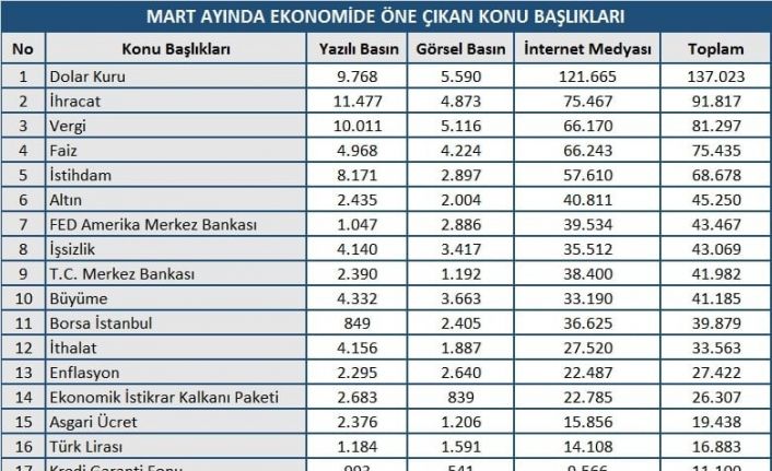 MEDYA TAKİP MERKEZİ (MTM), MART AYINDA ÖNE ÇIKAN EKONOMİ BAŞLIKLARINI BELİRLEDİ. RAPORA GÖRE, DOLAR KURUNDAKİ YÜKSELİŞ VE ALTIN KURUNDAKİ DALGALANMALAR GÜNDEMİ MEŞGUL EDERKEN, FED KARARLARI DA EN ÇOK KONUŞULAN KONULARIN BAŞINDA GELDİ.