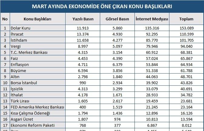 Mart ayında ekonomide öne çıkan başlıkların belirlendiği rapora göre, ekonomi gündeminde öncelikli olarak öne çıkan başlık dolar kuru oldu. Kısa Çalışma Ödeneği ve Ekonomi Reform Paketi de gündemde yer alan diğer başlıklar oldu.