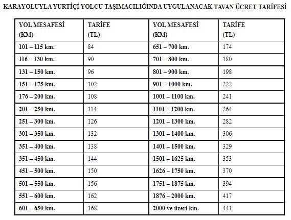 Kurban Bayramı öncesi otobüs bileti fiyatlarına tavan fiyat uygulaması başlatıldı. Konuyla ilgili Ulaştırma ve Altyapı Bakanlığının tebliği Resmi Gazete’de yayımlanarak yürürlüğe girdi. Buna göre tavan fiyat 3 ay geçerli olacak. Mesafesi 101-115 kilometre arası olan seyahatlerde bilet fiyatı 84 lira üstü olamayacak. 351-450 kilometre arası 144 lira, 651-700 kilometre arası ise 174 lira olacak. 2000 ve üzeri kilometre arası da en fazla 441 lira olacak.Otobüs biletlerine tavan fiyat uygulaması