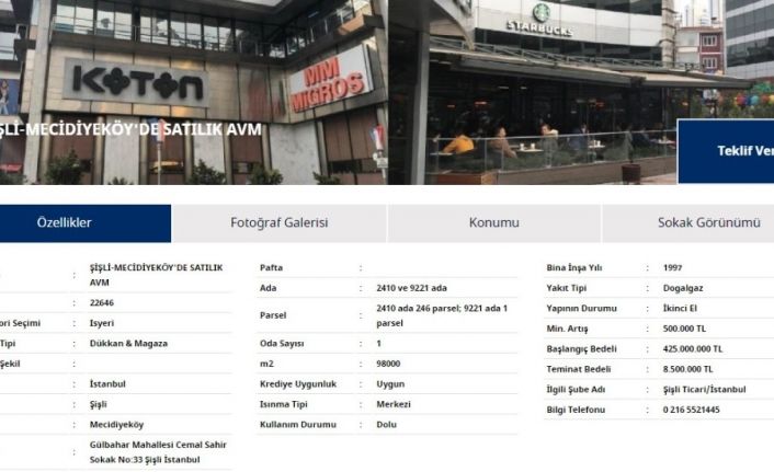 İstanbul Mecidiyeköy bulunan Profilo Alışveriş Merkezi 425 milyon TL başlangıç bedeli ile satışa çıktı.