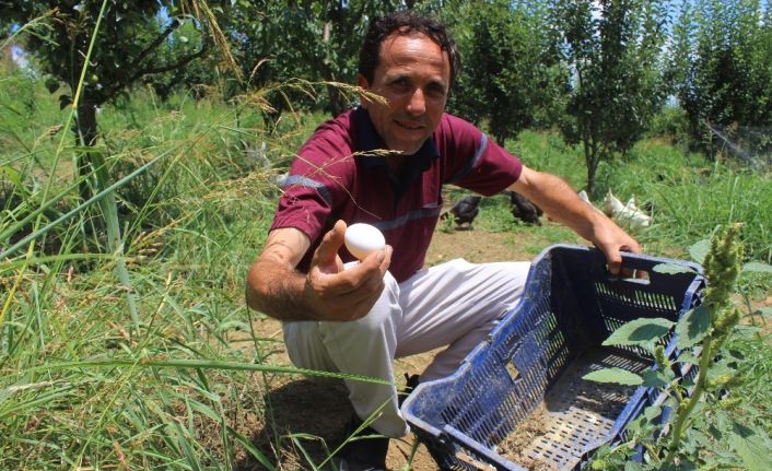 Meyveyle beslenen tavukların yumurtalarının daha lezzetli olduğu için büyük talep gördüğünü ifade eden Tacettin Ulu, "Ben organik yumurta üretimine başladım meyve bahçemi tel örgüyle çevirip burada tavuk bakıyorum. Tavuklarıma hiç yem vermiyorum. Tamamen bahçede çıkan otlarla beslenip bahçemde bulunan ağaçlardaki meyvelerle besliyorum. Meyveyle beslenen tavukların yumurtası çok lezzetli oluyor. Yazın yumurta satışları normalde düşer benim artış oluyor. Meyveyle beslenen tavuklardan elde ettiğim yumurtaları tanesini 2 liradan satıyorum. Büyük rağbet görüyor tüm yumurtalarımı hemen satıyorum" dedi.