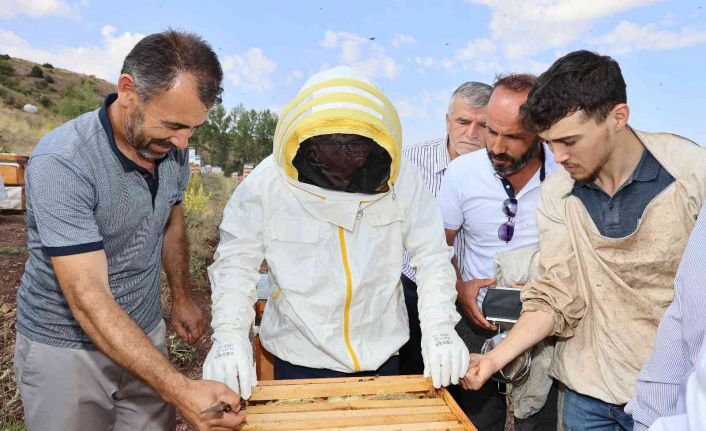 Bal üretiminde Türkiye’de ilk sıralarda yer alan Sivas, organik bal ve arı ürünleri ile de söz sahibi olma yönünde iddiasını sürdürüyor. Koloni sayısı ve bal üretimi bakımından Türkiye genelinde üçüncü, arıcılık işletme sayısı bakımından Türkiye’de ikinci olan Sivas’ın zengin nektar kaynaklarına sahip olması arıcıların yüzünü güldürüyor. 300 bine yakın arılı kovan ile kovan sayısı bakımından da Türkiye’de 7’nci sırada bulunan Sivas’ta 3 bin 500 üretici, toplam 7 bin kilogram bal üretimi bekliyor. Merkeze bağlı Gümüşdere köyünü ziyaret eden Vali Yılmaz Şimşek, bal hasadı yaptı. Arıcı kıyafeti giyerek hasadı gerçekleştiren Vali Şimşek, arıcılara bol ve hayırlı hasatlar dileğinde bulundu.