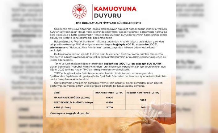 Ayrıca açıklamada haziran ayında TMO’ya ürün teslim eden üreticilerin primlerinin temmuzda; temmuz ve ağustos aylarında ürün teslim eden üreticilerin prim ödemelerinin ise takip eden ay içinde yapılacağı bildirildi. Bakanlık tarafından üreticilere “Tarım ve Orman Bakanlığımız tarafından buğday için bin lira/ton, arpa için 500 lira/ton olarak ödenecek hububat alım priminden üreticilerimizin yararlanmaları için ürünlerini en geç 1 Eylül 2022 tarihine kadar TMO’ya satmış olmaları gerekmektedir” uyarısı yapıldı.