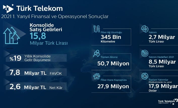 Türk Telekom, 2021’in ilk yarı finansal ve operasyonel sonuçlarını açıkladı. Yılın ilk 6 ayında yüzde 19 büyüme ile 15,8 milyar TL gelir elde eden şirketin faiz, amortisman ve vergi öncesi kârı (FAVÖK) 7,8 milyar TL’ye ulaşırken, ilk yarı yılda FAVÖK marjı ise yüzde 49,6 oldu. Yılın ilk yarısında 2,6 milyar TL net kâr elde eden şirketin yatırım harcamaları da ilk 6 ayda geçen yılın aynı dönemine göre yüzde 25 artarak 2,7 milyar TL’ye yükseldi.