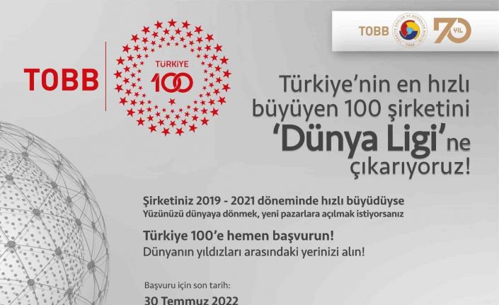 Türkiye Odalar ve Borsalar Birliği (TOBB) öncülüğünde, Türkiye Ekonomi Politikaları Araştırma Vakfı (TEPAV) ve TOBB Ekonomi ve Teknoloji Üniversitesi (TOBB ETÜ) iş birliğinde gerçekleştirilen “Türkiye 100” programının sekizinci dönemi başladı. En hızlı büyüyen firmaların belirleneceği Türkiye 100 programı için başvurular, 30 Temmuz 2022 tarihine kadar //turkiye100.tobb.org.tr adresinden yapılabilecek. Programda ilk 100’e giren şirketlere yeni ortaklıkların kapısı açılırken, birçok platformda tanıtım imkânı sağlanacak.
