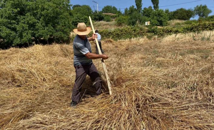 Manisa’nın Alaşehir ilçesinde olumsuz hava şartları nedeniyle yere yatan buğday ve arpaya biçerdöver giremediği için çiftçiler geleneksel yöntemlerle hasada başladı.