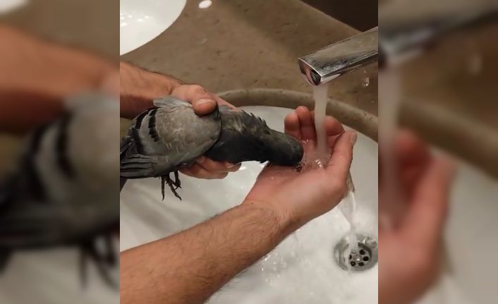 Edinilen bilgiye göre, Fethi Sekin Şehir Hastanesi’nde bir güvercin asansör ile kapısı arasına sıkıştı. Güvercinin sıkıştığını gören bir hastane personeli, kuşu kurtardı. Ardından kuşu lavaboya götüren personel avcuna su doldurdu. Personelin avcundan kana kana su içen güvercin kendine geldi. Personel daha sonra sağlık durumu iyi olan kuşu doğaya geri saldı. O anlar görenlerin içini ısıttı.