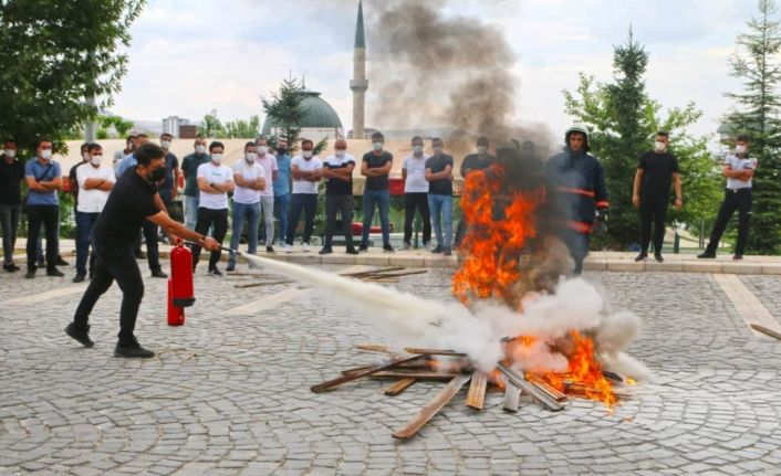 Yangın esnasında dikkat edilmesi gereken hususlar hakkında verilen eğitimin ardından ayrı bir alanda yangın söndürme uygulaması yapıldı. Ülkede yaşanan orman yangınları ve yangılarda yaşanan acı kayıpların ardından alınacak tedbirlerin hayati önem taşıdığına dikkat çeken Elazığ Belediyesi İtfaiye Müdürü İbrahim Halil Başgün, ’’Belediyemizde görevli güvenlik personeline ‘yangın çıkmaması için gerekli tedbirlerin alınması’ ve ‘olası yangın durumlarında yapılması gerekenler’ hakkında teorik ve uygulamalı eğitim verdik. Manavgat’ta başlayan ve ülkemizin birçok bölgesinde etkili olan orman yangınları hepimizin içini yaktı. Elazığ Belediyesi olarak biz de bölgemizde oluşması muhtemel orman yangınlarına karşı önlemlerimizi almaya devam ediyoruz. Belediyemizde ve çevresinde meydana gelebilecek olası yangınlar için güvenlik personelimize yangın eğitimi verdik. Hemen akabinde ise tatbikat yaptık. Çalışanlarımızın yaşanabilecek herhangi bir yangın durumunda olaya hızlı ve etkili bir şekilde müdahale edebilmesi hayati önem arz ediyor’’ dedi.Elazığ Belediyesinden güvenlik personeline yangın eğitimi