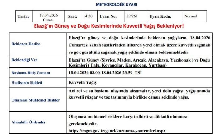 Meteoroloji 13. Bölge Müdürlüğü’nden yapılan açıklamada, "Elazığ’ın güney ve doğu kesimlerinde beklenen yağışların, 18.04.2026 Cumartesi sabah saatlerinden itibaren yerel olmak üzere kuvvetli sağanak ve gök gürültülü sağanak yağış şeklinde olması beklenmektedir. Beklendiği yer Elazığ’ın güney (Sivrice, Maden, Arıcak, Alacakaya, Yazıkonak ) ve doğu kesimleridir ( Palu, Kovancılar, Karakoçan, Yurtbaşı). Oluşması muhtemel riskler; ani sel ve su baskını, ulaşımda aksamalar, yerel dolu yağışı, yağış anında kuvvetli rüzgar ve toz taşınımıyla birlikte çamur şeklinde yağıştır. Oluşması muhtemel risklere karşı tedbirli ve dikkatli olunması gerekmektedir" denildi.