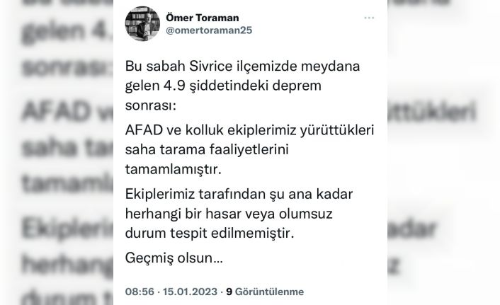 Vali Dr. Ömer Toraman paylaşımında, “Bu sabah Sivrice ilçemizde meydana gelen 4.9 şiddetindeki deprem sonrası: AFAD ve kolluk ekiplerimiz yürüttükleri saha tarama faaliyetlerini tamamlamıştır. Ekiplerimiz tarafından şu ana kadar herhangi bir hasar veya olumsuz durum tespit edilmemiştir. Geçmiş olsun” dedi.