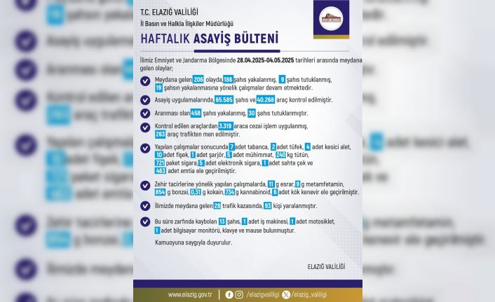Elazığ Valiliği, son 1 haftalık asayiş verilerini paylaştı. Buna göre son bir hafta içerisinde 206 olay meydana gelirken, 186 şahıs yakalandı ve şahıslardan 9’u tutuklanarak cezaevine gönderildi. Asayiş uygulamalarında 65 bin 585 şahıs ve 40 bin 268 araç kontrol edildi. Aranması olan 458 şahıs yakalanırken, 30 şahıs tutuklanarak cezaevine gönderildi. Kontrol edilen araçlardan 3 bin 319 araca cezai işlem uygulanırken 263 araç trafikten men edildi.