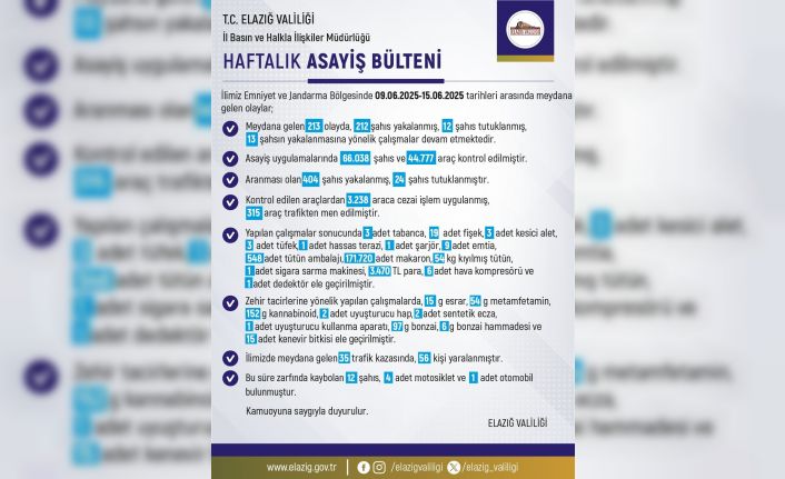 Elazığ Valiliği, son 1 haftalık asayiş verilerini paylaştı. Buna göre son bir haftada 213 olay meydana gelirken, 212 şahıs yakalandı ve şahıslardan 12’si tutuklanarak cezaevine gönderildi. Asayiş uygulamalarında 66 bin 38 şahıs ve 44 bin 777 araç kontrol edildi. Aranması olan 404 şahıs yakalanırken, 24 şahıs tutuklanarak cezaevine gönderildi. Kontrol edilen araçlardan 3 bin 238 araca cezai işlem uygulanırken 315 araç trafikten men edildi.