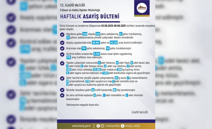 Elazığ Valiliği, son 1 haftalık asayiş verilerini paylaştı. Buna göre son bir haftada 228 olay meydana gelirken, 220 şahıs yakalandı ve şahıslardan 9’u tutuklanarak cezaevine gönderildi. Asayiş uygulamalarında 85 bin 601 şahıs ve 50 bin 220 araç kontrol edildi. Aranması olan 751 şahıs yakalanırken, 18 şahıs tutuklanarak cezaevine gönderildi. Kontrol edilen araçlardan 3 bin 238 araca cezai işlem uygulanırken 276 araç trafikten men edildi.