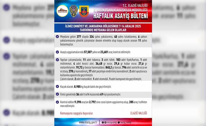 Elazığ Valiliği, 7-14 Aralık 2025 tarihleri arasındaki haftalık asayiş verilerini açıkladı. Kent genelinde meydana gelen 277 olayda 334 şüpheli yakalanırken, 40 kişi tutuklandı. Çalışmalarda 57 bin 507 şahıs ve 23 bin 601 araç denetlendi. Kontrol edilen araçlardan, 2 bin 792’sine cezai işlem uygulanırken 205 araç da trafikten men edildi. Kent genelinde meydana gelen 36 adet trafik kazasında 49 kişinin yaralandı.