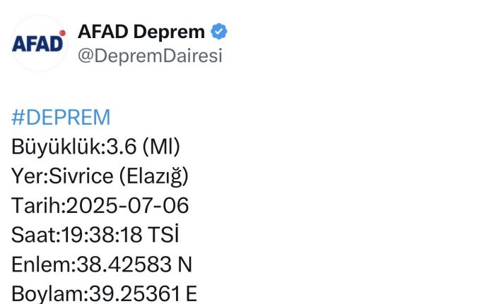 Afet ve Acil Durum Yönetimi Başkanlığı Deprem Dairesi Başkanlığından alınan bilgiye göre, saat 19:38’de merkez üssü Elazığ’ın Sivrice ilçesinde 3.6 büyüklüğünde deprem meydana geldi. Yerin yaklaşık 6 kilometre derinliğinde meydana gelen depremle ilgili olumsuz bir durum yaşanmadığı öğrenildi.