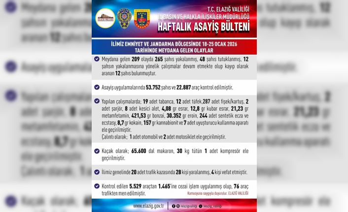 Elazığ Valiliği, 18-25 Ocak 2026 tarihlerini kapsayan haftalık asayiş bültenini yayımladı. Bültende yer alan bilgilere göre, kent genelinde meydana gelen 209 olayda 265 şahıs yakalandı, 48 kişi de tutuklandı. Çalışmalarda 53 bin 752 şahıs ve 22 bin 887 araç denetlendi. Kontrol edilen araçlardan, bin 465’inde cezai işlem uygulanırken 76 araç da trafikten men edildi. Kent genelinde meydana gelen 20 adet trafik kazasında 28 kişi yaralanırken 4 kişi de hayatını kaybetti.