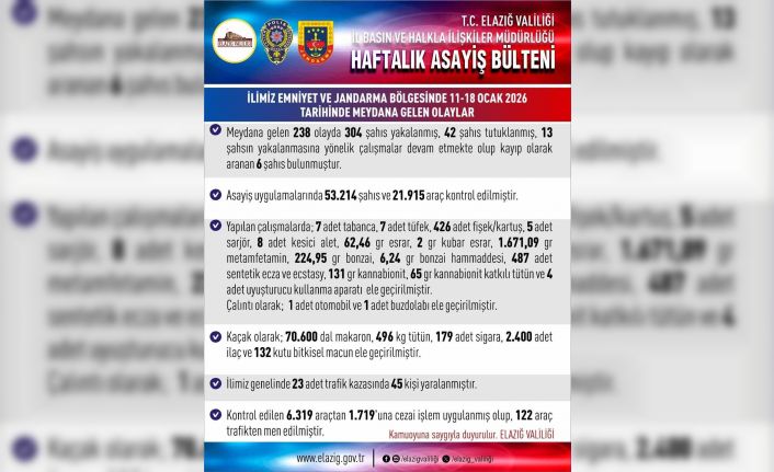 Elazığ Valiliği, 11-18 Ocak 2026 tarihlerini kapsayan haftalık asayiş bültenini yayımladı. Bültende yer alan bilgilere göre, kent genelinde meydana gelen 238 olayda 304 şahıs yakalandı, 42 kişi de tutuklandı. Çalışmalarda 53 bin 214 şahıs ve 21 bin 915 araç denetlendi. Kontrol edilen araçlardan, bin 719’una cezai işlem uygulanırken 112 araç da trafikten men edildi. Kent genelinde meydana gelen 23 adet trafik kazasında 45 kişinin yaralandı.