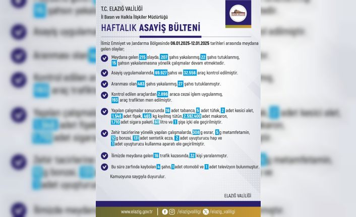 Elazığ Valiliği 6-12 Ocak arasında meydana gelen olaylar ve verileri paylaştı Buna göre Meydana gelen 215 olayda 207 şahıs yakalanırken 22’sinin tutuklandığı 15 şahsın yakalanmasına yönelik çalışmaların devam ettiği kaydedildi. 69 bin 927 şahıs ve 32 bin 556 araç kontrol edilirken aranması olan 483 şahıs yakalandı, 21’i tutuklanarak cezaevine gönderildi. Kontrol edilen araçlardan 2 bin 896’sına cezai işlem uygulanırken 93 araç trafikten men edildi. Yapılan çalışmalar sonucunda 16 adet tabanca, 5 adet tüfek, bin 548 adet fişek, 465 kilo kıyılmış tütün, 2 milyon 592 bin 400 adet makaron, bin 710 adet sigara paketi, 60 litre ve 1 sise içki ele geçirildi.