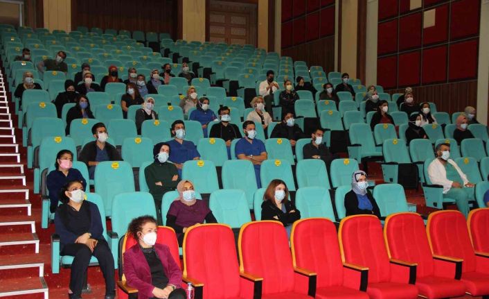 Konferans salonunda yapılan eğitime çok sayıda sağlık çalışanı katıldı.