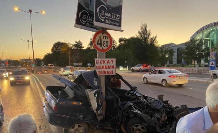 Elazığda aydınlatma direğine çarpan otomobil hurdaya dönerken sürücü yara almadan kurtuldu.