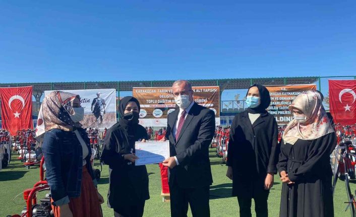 Eğitimini başarıyla tamamlayan kadın çiftçilere DAP Kalkınma İdaresi Hibe Desteği dahilinde 1.4 milyon lira değerinde 214 adet süt sağım makinası, 20 adet süt soğutma tankı, 18 adet küçükbaş yün kırkım makinası, 190 adet otomatik yemlik, 1 adet taş toplama makinesi ve 1 adet katı gübre dağıtma makinasının dağıtımı gerçekleştirildi. Vali Dr. Ömer Toraman sertifika töreninin ardından Karakoçan Kaymakamlığı ve Karakoçan Belediyesini ziyaret ederek Kaymakam Abdullah Şahin ve Belediye Başkanı Ayhan Akbaba’dan bilgi aldı.