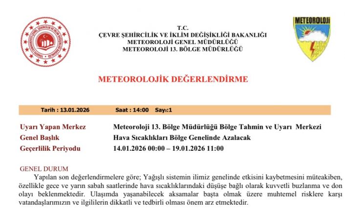 Meteoroloji 13. Bölge Müdürlüğü’nden yapılan uyarıda, "Yapılan son değerlendirmelere göre; yağışlı sistemin ilimiz genelinde etkisini kaybetmesini müteakiben, özellikle gece ve yarın sabah saatlerinde hava sıcaklıklarındaki düşüşe bağlı olarak kuvvetli buzlanma ve don olayı beklenmektedir. Ulaşımda yaşanabilecek aksamalar başta olmak üzere muhtemel risklere karşı vatandaşlarımızın ve ilgililerin dikkatli ve tedbirli olması önem arz etmektedir. Mevsim normalleri civarında seyreden hava sıcaklıkların yağış sonrası önümüzdeki günlerde mevsim normallerinin 4 ila 7 derece altında seyretmesi beklenmektedir" denildi.