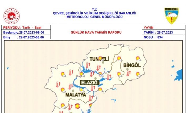 Meteoroloji 13. Bölge Müdürlüğü, Elazığ, Malatya, Bingöl, Adıyaman ve Tunceli için sıcak hava dalga uyarısı yaptı.