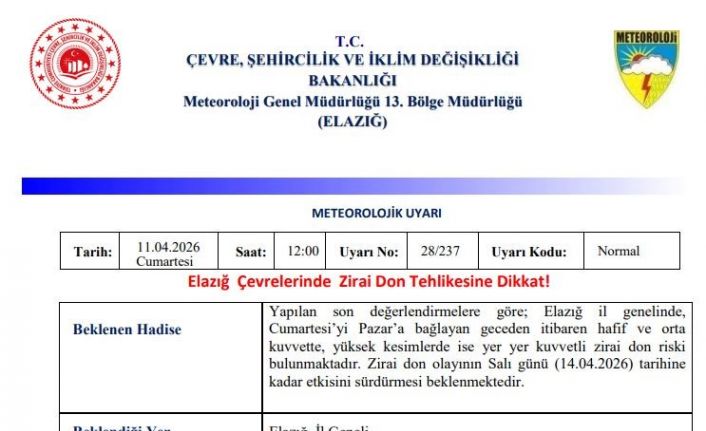 Meteoroloji 13. Bölge Müdürlüğü’nden yapılan açıklamada, "Yapılan son değerlendirmelere göre; Elazığ il genelinde, cumartesiyi pazara bağlayan geceden itibaren hafif ve orta kuvvette, yüksek kesimlerde ise yer yer kuvvetli zirai don riski bulunmaktadır. Zirai don olayının Salı günü (14.04.2026) tarihine kadar etkisini sürdürmesi beklenmektedir" denildi.