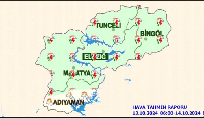 Meteoroloji 13. Bölge Müdürlüğü’nden yapılan açıklamada, “Bölgemiz genelinde havanın parçalı bulutlu, öğleden sonra Elazığ, Bingöl, Malatya, Tunceli il genelleri ile Adıyaman’ın kuzey kesimlerinin sağanak ve gök gürültülü sağanak yağışlı geçeceği; Hava sıcaklıkları mevsim normallerinin 3 ila 5 derece üzerinde seyredeceği; rüzgarların kuzeyli yönlerden hafif, yağış anında orta kuvvette eseceği tahmin edilmektedir” denildi.