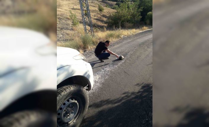Elazığ’da aracı ile seyir halinde olan bir vatandaş yolun ortasında bir kaplumbağa gördü. Sıcaklardan bitkin düşen kaplumbağayı gören vatandaş,aracını durdurarak yanında bulunan pet şişe ile kaplumbağaya su içirdi.