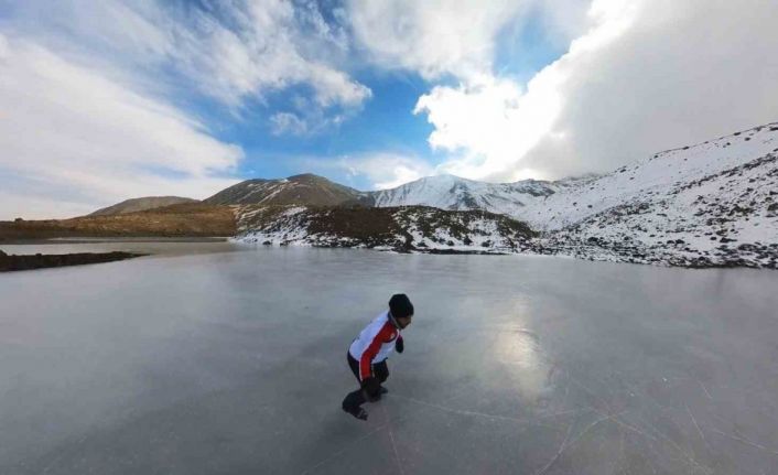 Erzincan’da kayak antrenörü Canser Atila, Keşiş Dağlarında 3 bin 549 metre yükseklikte Yedi Göller mevkiinde yüzeyi buzla kaplanan göletin üzerinde buz pateni yaptı.