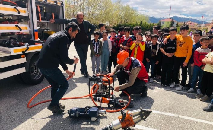 Eğitmenler, 6 Şubat Kahramanmaraş merkezli afet sonrasında sahada edindikleri tecrübe ve gözlemlerini pedagojik çerçevede öğrencilerle paylaşarak öğrencilere arama ve kurtarmada kullanılan araç ve ekipmanları da tanıttılar.