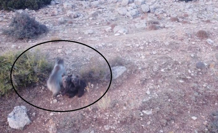 Erzincan’ın Tercan ilçesinde dağlık arazide anne ayı ve 2 küçük yavrusu, dron ile havadan görüntülendi.