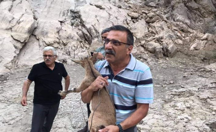 Erzincan’ın Kemaliye ilçesinde ayağına tel takılmış yavru bir dağ keçisine vatandaşlar yardım eli uzattı.