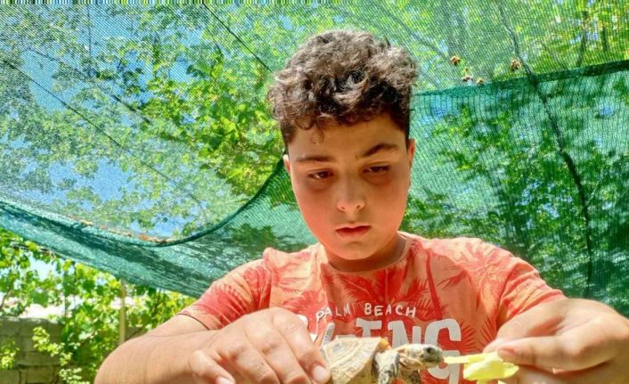 Erzincan’ın Üzümlü ilçesi Bayırbağ köyünde yaşayan 12 yaşında ki Ömer Asaf Gürler tarlada bulduğu kaplumbağayı evinde besliyor.