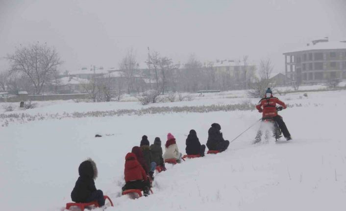 Erzincan’da karla kaplanan boş arazide toplanan çocuklar, kros motorunun arkasına bağlanan kızaklarla doyasıya kaymanın tadını çıkardı.