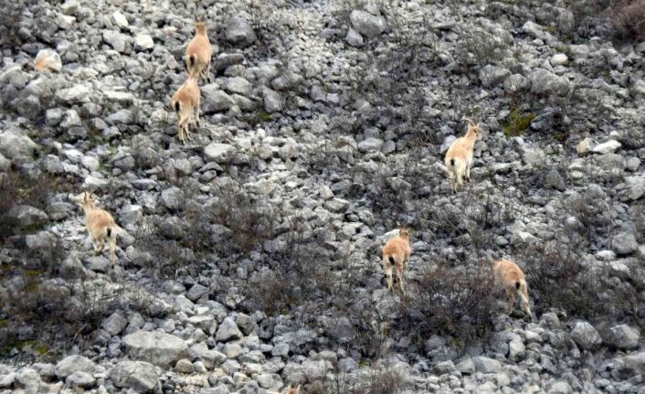 Bir vatandaşın dron ile havadan çekim yaptığı sırada ise dağ keçisi sürüsü kadraja yansıdı. Dronu yırtıcı kuş olarak kendilerine tehdit gören dağ keçileri koşarak uzaklaşmaya çalıştı. Zaman zaman da duraksayıp drona bakan dağ keçileri izleyenleri tebessüm ettirdi.
