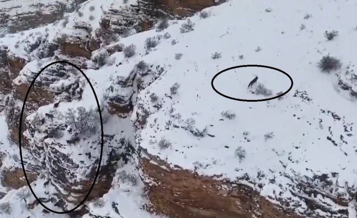 Mevsime bağlı zirvelerden alçak kesimlere inen dağ keçileri kış aylarında göç yoluna koyuluyor. Göç yolunda karlı zirvelere çıkan yaban keçileri drone ile havadan görüntülendi. Dağ keçileriyle birlikte kadraja giren kurt ise dikkat çekti.