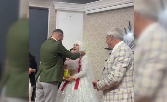 Erzincan’da düzenlenen bir nikah töreninde gelin ve damada takı merasiminde 5 litrelik Ayçiçek yağı takıldı.