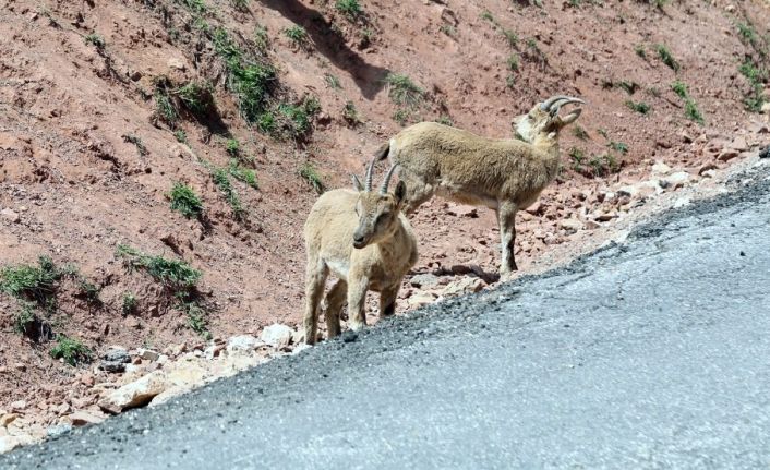Erzincan - İliç ilçesi yolunda koruma altında olan yaban keçileri, yola kadar indi. Yolu kullanan vatandaşlar ise yaban keçilerini görünce büyük bir sürpriz yaşadı. Bir anda karşılarında asfaltta tuz ihtiyaçlarını gidermek için karayoluna kadar inen dağ keçilerini gören vatandaşlar, cep telefonlarına sarılarak o anları kaydetti.
