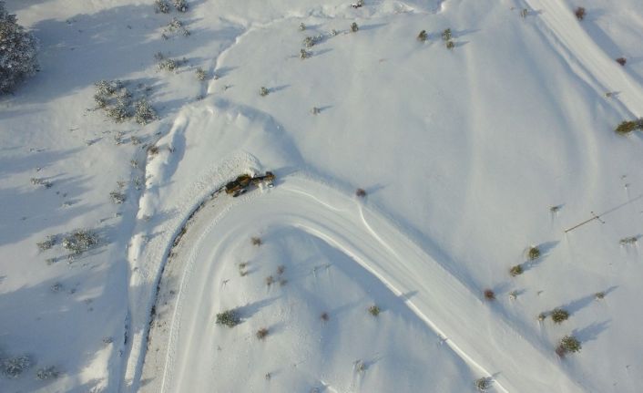Erzincan ve ilçelerinde dün akşamdan itibaren etkili olan kar yağışı nedeniyle 267 köy yolu ulaşıma kapandı. Karla mücadele çalışması drone ile havadan görüntülendi.