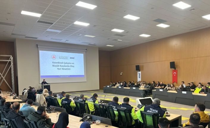 Eğitimde, afet ve acil durumlarda kurumlar arası iş birliğinin önemi vurgulanırken, katılımcılara sahada etkin ve hızlı müdahale yöntemleri hakkında bilgi verildi.