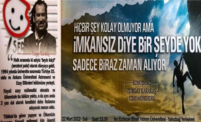 Özel çocuklara öyküsüyle ilham veren Serebral Palsili Uzay Mühendisi Turgay Karakaş’ın konuşmacı olarak katılacağı konferans ile ilgili bilgi veren Kent Konseyi Başkanı Hikmet Köksal, "22 Mart Salı günü Prof.Dr. Erdoğan Büyükkasap Konferans Salonunda İlk Serebral Palsili Uzay Mühendisi Turgay Karakaş tarafından "İmkansız diye bir şey yok. Sadece biraz zaman alıyor" konulu bir konferans verilecek. Özel insan ve özel öyküsü olan ve yaptığı çalışmalar ile örnek olan Türkiye’nin ilk Serebral Palsili Uzay Mühendisi Turgay Karakaş’ı tüm Erzincan halkının tanımasını ve dinlemesini istiyor ve bekliyoruz.” dedi.