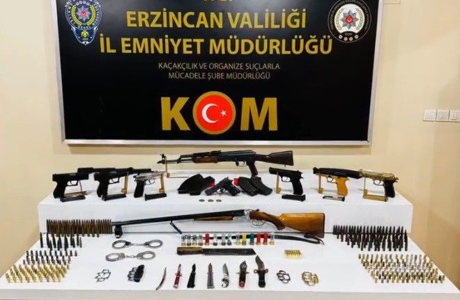 Erzincan İl Emniyet Müdürlüğü Kaçakçılık ve Organize Suçlarla Mücadele Şube Müdürlüğü ekiplerince; Erzincan il merkezinde, 6136 SKM silah ticareti ve nitelikli dolandırıcılık suçlarının önlenmesine yönelik 200 personelin katılımıyla 22 adreste eş zamanlı operasyon gerçekleştirildi. Gerçekleştirilen operasyon kapsamında şüphelilerin ikametleri ve eklentilerinde yapılan aramalarda; 1 adet Ak-47 uzun namlulu silah, 146 adet uzun namlulu silah fişeği, 4 adet ak-47 şarjörü, 7 adet ruhsatsız tabanca ve tabancalara ait 287 adet farklı ebat ve çaplarda fişek, 11 adet tabanca şarjörü, 1 adet yivsiz av tüfeği, 14 adet av tüfeği kartuşu, 1 adet pompalı tüfek şarjörü, 4 adet muşta, 7 adet bıçak, 2 adet kelepçe, 3 adet tarihi eser olduğu değerlendirilen Roma dönemine ait altın sikke ele geçirildi.